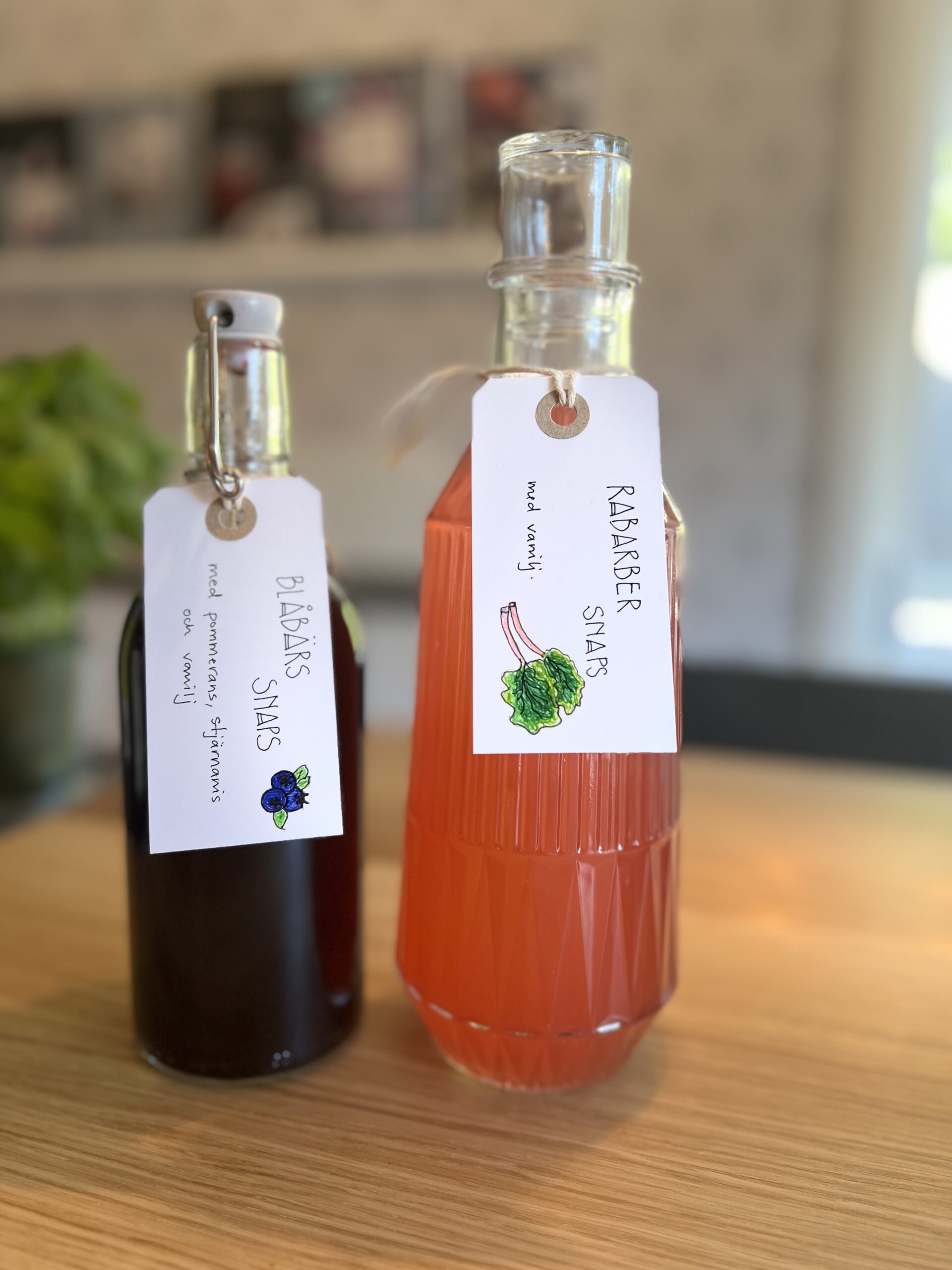 Jag hann också sila upp mina snapsar som jag ruvat på ett par veckor. En god vän kom förbi en dag och ville ta rabarber till en midsommarsnaps och efter lite småprat så var det plötsligt jag som stod med uppdraget att göra snaps! Kan också ha varit så att jag erbjöd mig för att jag tycker att det är så kul! Så dubbel sats med rabarber, vanilj och en liten luring med blåbär, pomerans, stjärnanis och vanilj. I två veckor har dessa stått ute i mitt förråd och gottat sig!