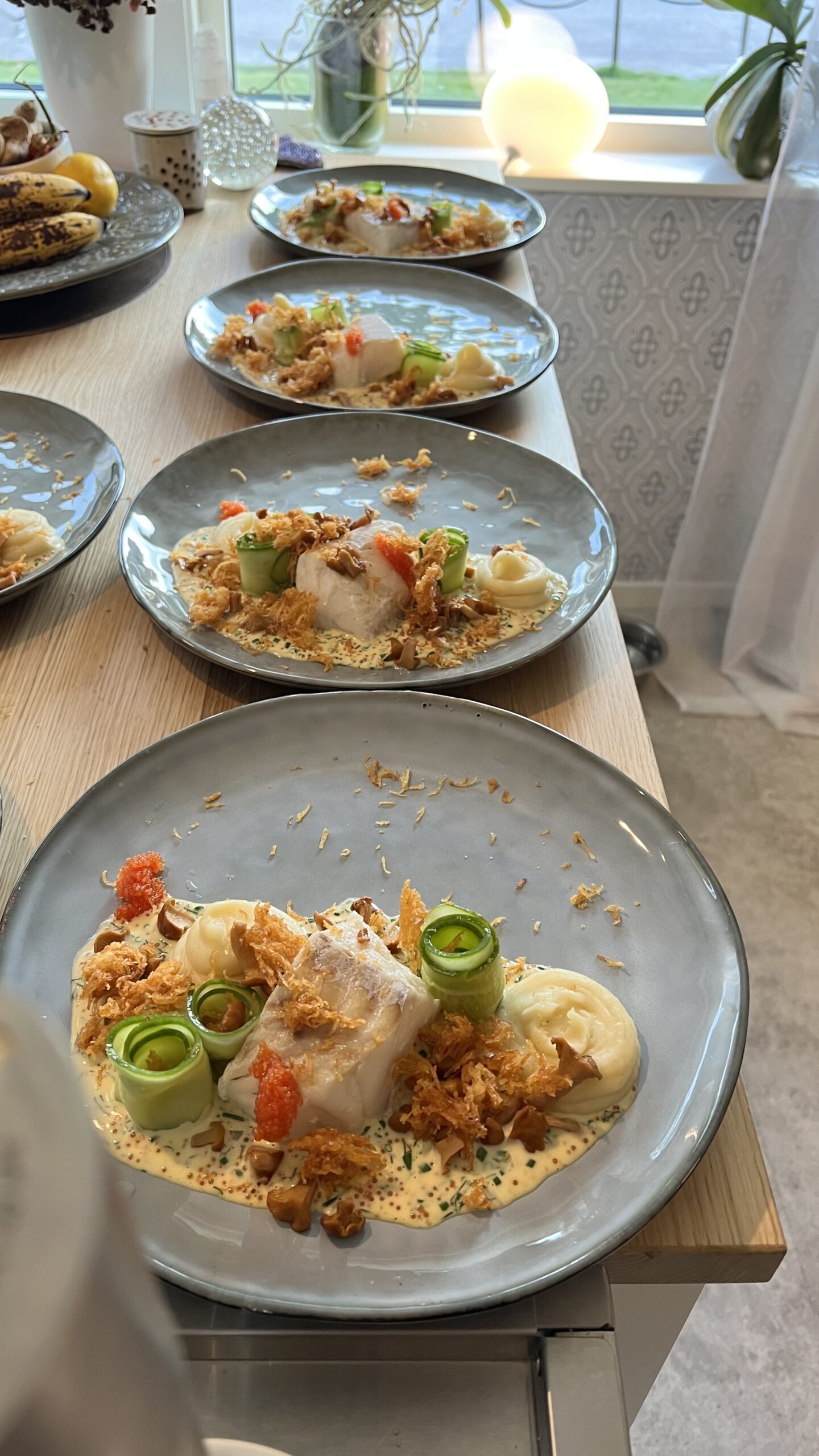 Nästa ställe var ju då hemma hos oss! Jag hade gjort en lättrimmad torskrygg i sous viden på 47 grader. Till den serverade jag en potatispuré med muskot, en sandefjordsås, picklade kantareller och gurka dressad med citron och salt och en finriven friterad potatis som lite strössel på toppen.