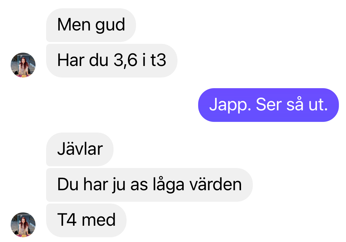 Där står jag, rödgråten, med tårar rinnandes ner för kinderna, en lista, som är längre än den en 5-åring ger till tomten på jul, på symptom, som ALLA tyder på underfunktion av sköldkörteln och förklimakteriet, 9kg i övervikt och slakthusmens dag 2 (ni som vet ni vet) Och får frågan om det möjligen inte kan vara så att jag är på smällen!!! Men mig veterligen så jag jag ingen jävla elefant som är gravid i över ett år! Men jodå, graviditetstest togs och så även prover på sköldkörteln.