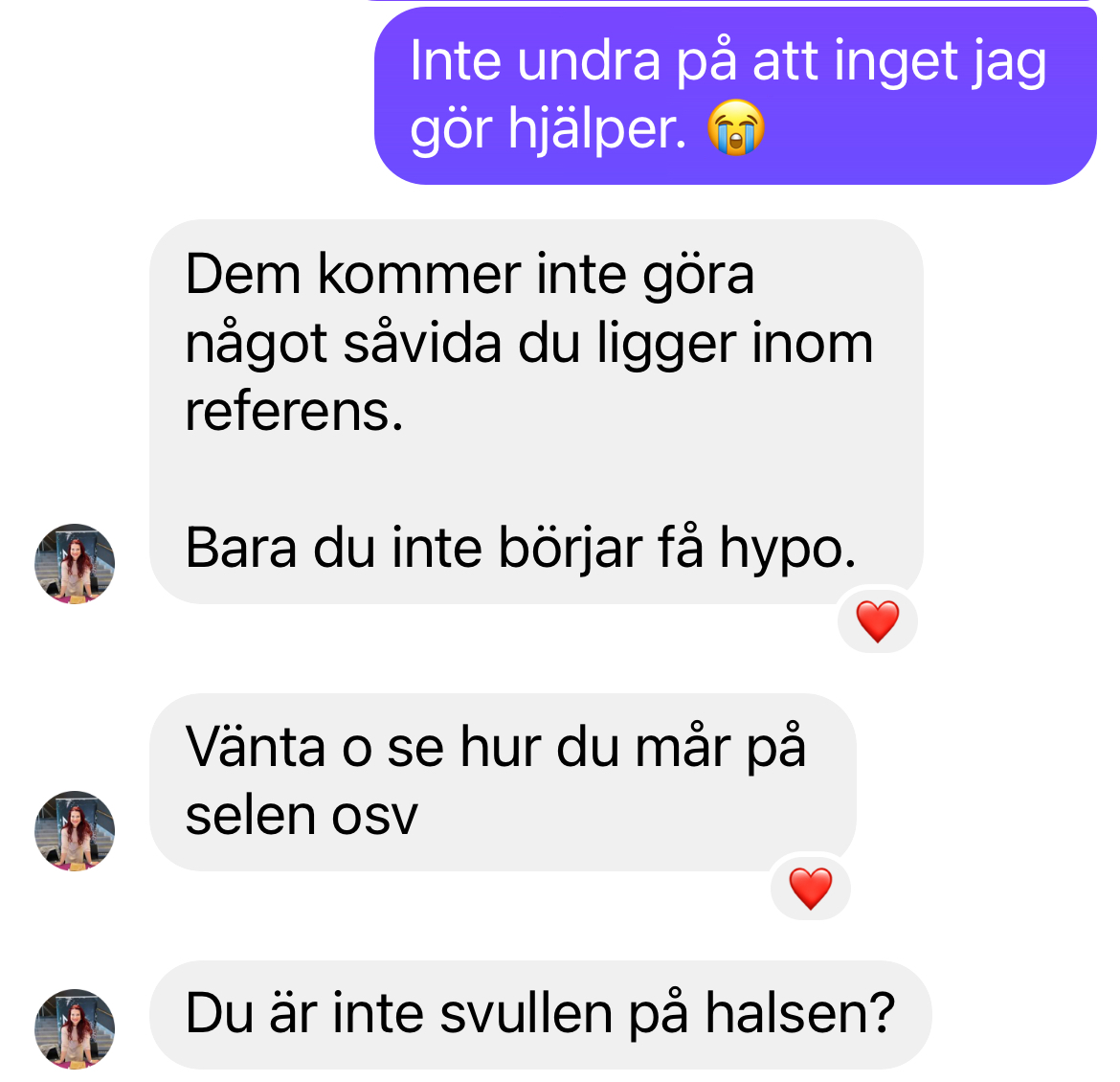 Ja, då får vi ju vänta och se vad läkaren säger, men risken är ju som Nicole skriver att inget kommer göras så länge mina värden ligger inom referens. Hon har preppat mig med selen, b-vitaminer, magnesium, zink och d-vitamin. Det verkar inte spela nån roll att jag har prover från flera år tillbaka som visar att värdena just det senaste året, då jag mått dåligt, har försämrats avsevärt. Vården tar inte hänsyn till att det värde som är optimalt för mig som kanske fortfarande är inom referens men ändå gör just MIG sjuk! Alla dras över samma kam. Förmodligen på värden som tagits fram på 30-åriga män. Som ju den mesta forskning och statistik baseras på. Så nu väntar jag med spänning på att läkaren ska återkomma, hon lovade att ringa och rådfråga endokinologen i morgon så jag väljer att tro att det fortfarande kan finnas hopp. Då vi har både struma, hjärtsjukdomar, vitilgio i släkten och jag redan har en autoimmun diagnos så vill jag ju lösa detta innan det läggs ännu en på listan!