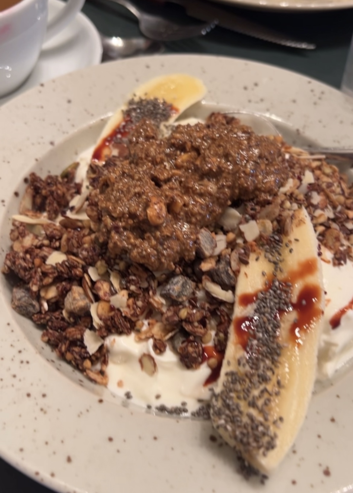 Macka med burrata, äggröra och tomat. Yoghurt med banan, hasselnötssmör och granola. Himmelriket!
